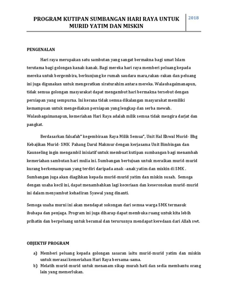 Kertas kerja program sambutan hari raya aidilfitri peringkat sekolah kebangsaan kampung busut baru · author / uploaded · zaifi ras. Kertas kerja sambutan hari raya aidilfitri di sekolah untuk dijadikan panduan dan rujukan kepada guru. ١١ جمادى الآخرة ١٤٤٣ هـ.